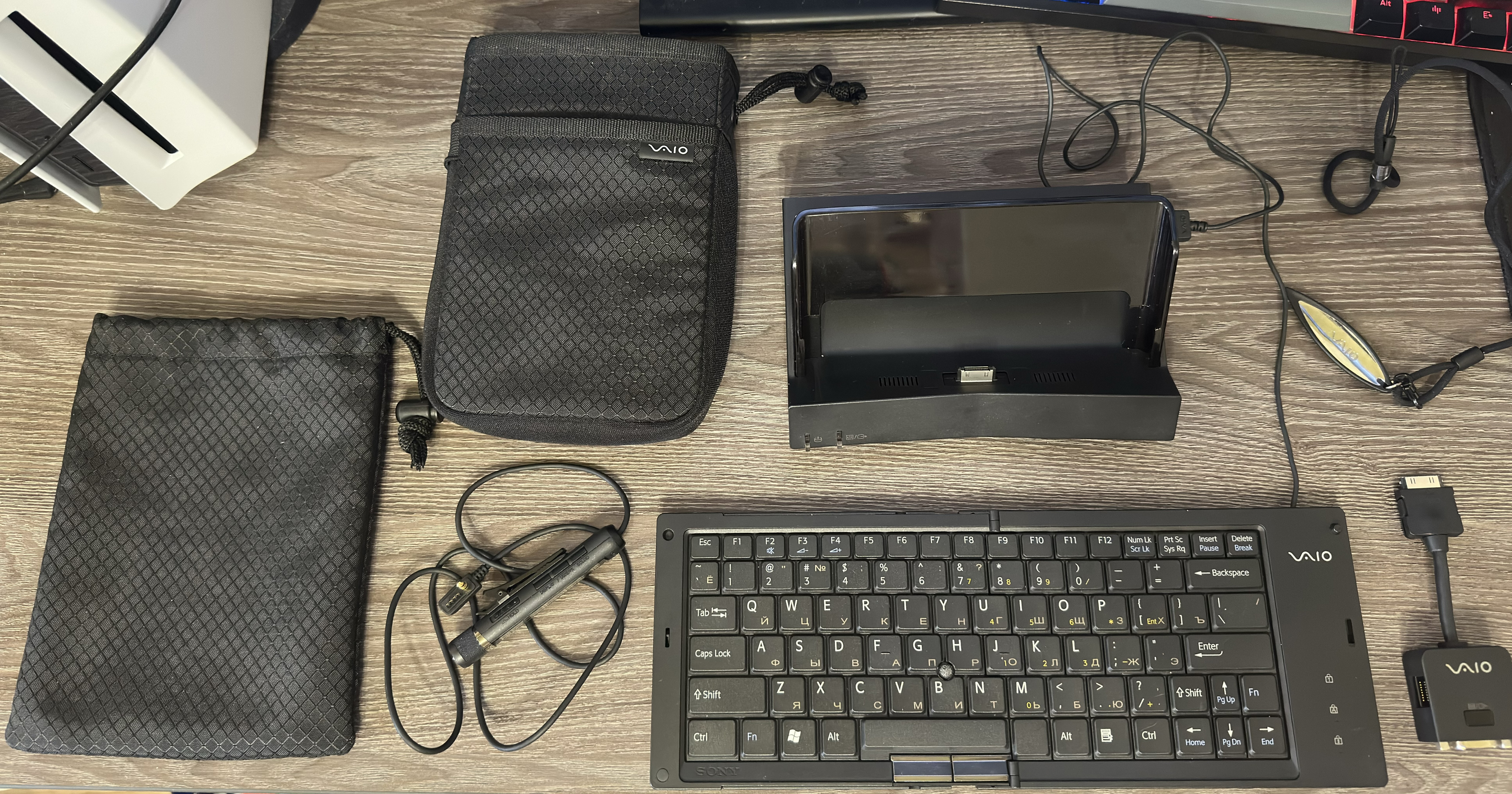 VGN-U Accessories: VGP-PRU1 Port Replicator, VGP-KBC1 Foldable Keyboard, VGA/Ethernet dongle, Remote Commander, stylus and pouches for the computer itself and the keyboard