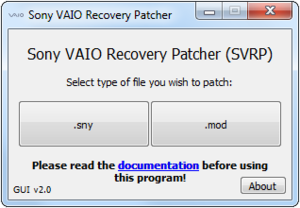 SVRP is a utility designed to patch and combine split WIM (.sny) and .mod files from Sony VAIO recoveries, in order to bypass Sony's model checks. This tool can be used when the recovery discs refuse to install, as they were not made on the unit they are trying to be installed on. Basically, it's a recovery cracker.