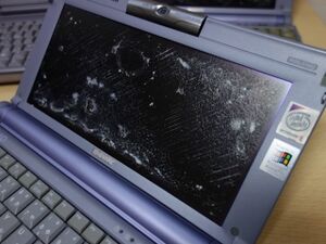The antiglare coating of the  LCD also can start breaking down, in which case it is only necessary to remove it, which does not require opening the laptop. To do this, one must gently start rubbing away the antiglare with a microfibre cloth to remove the coating. After this, you should have a whole display which is glossy rather than matte.