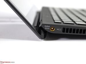 The case is made of flexible carbon fiber, which makes the laptop very light at only 860 g (1.9 pounds). When the display is opened, the bottom half of the laptop gets slightly elevated, which makes for an more comfortable typing experience. It was avaliable in black, silver and glossy red.